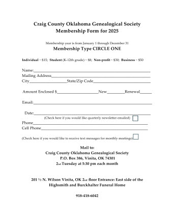 County Oklahoma Genealogical Society dues are $15.00; Student (K-12th grade) ~