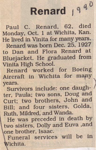 Hello, At the moment I do not have an obit on Flora Renard, but I do have one on her son, Paul which I have attached. I have quite a number more obit scrapbooks of my mother's, Eunice Hightower, 89, of Vinita, OK to index so there is still the possibility that there is one of Flora, but not at this time. I hope that this helps. Here is the list of other Renards that I have in the scrapbooks. This volume I indexed each person listed in the obits as having already passed away, thus several are listed on the same page: Renard Dan 136 C Renard Dolly M. (Mrs. Brown) 37, 170 B Renard Flora (Mrs.) 136 C Renard Frank 113 A Renard Isaac 136 C Renard Mabel (Mrs.) 247 A Renard Mabel (Mrs.) 110 F Renard Paul C. 136 C Renard (nee) Dolly 136 C Renard (nee) Euva 136 C ------------ Sincerely, Eddene Hightower Thompson