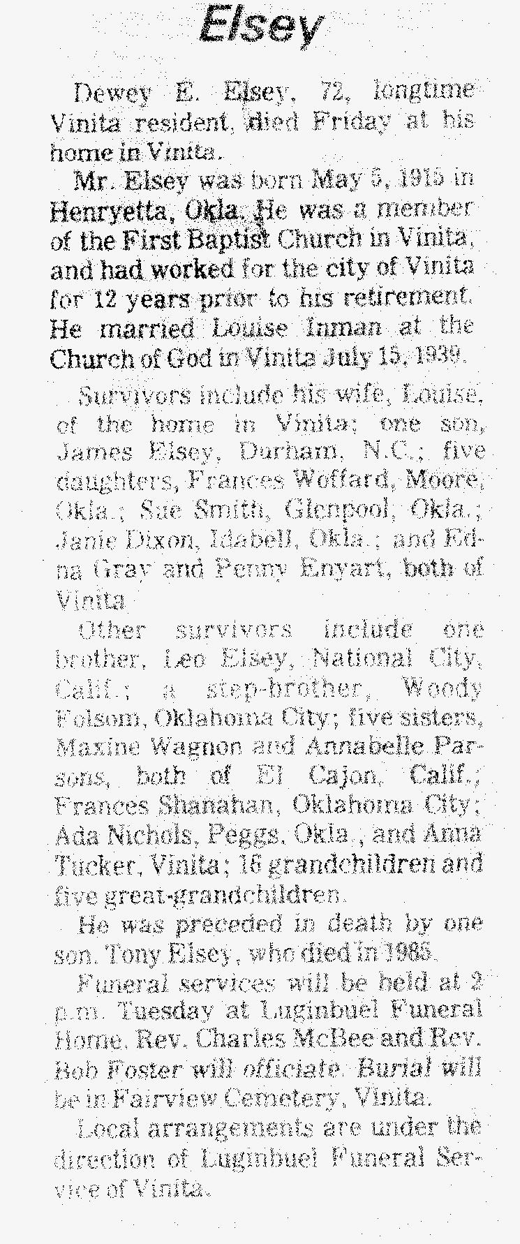 Hello, I'm sorry, but the scanned obit of Dewey Elsey didn't turn out very readable, so I have typed it up. I didn't have a 'date' for the obit, so have looked it up in the Social Security Death Index online. I would suggest looking these children up in an online people search such as Yahoo People Search and perhaps you can find a way to contact them. Good luck. Eddene ---------------- Here is the link to my FreePages at Rootsweb where I have an index to one volume each of weddings and anniversaries as published in the Vinita (Ok) Daily Journal and the seven (7) volumes of obits: http://freepages.genealogy.rootsweb.ancestry.com/~eddene/ ====================== SOCIAL SECURITY DEATH INDEX ONLINE: Name: Dewey E. Elsey SSN: 442-18-2306 Last Residence: 74301 Vinita, Craig, Oklahoma, Born: 5 May 1915 Died: 13 Nov 1987 State (Year) SSN issued: Oklahoma (Before 1951 ) .......... ELSEY
