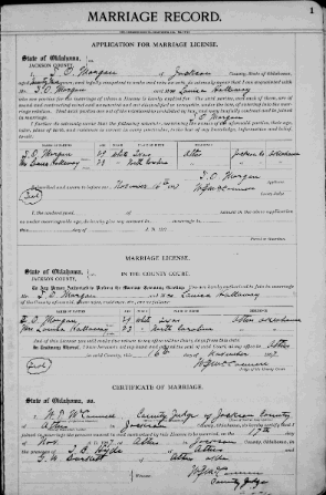 Jackson Marriage Record 1, p.1 S. O. Morgan (Samuel) and Mrs. Louisa Holloway (nee Adams) 17 Nov 1907 Click on image for larger version. |