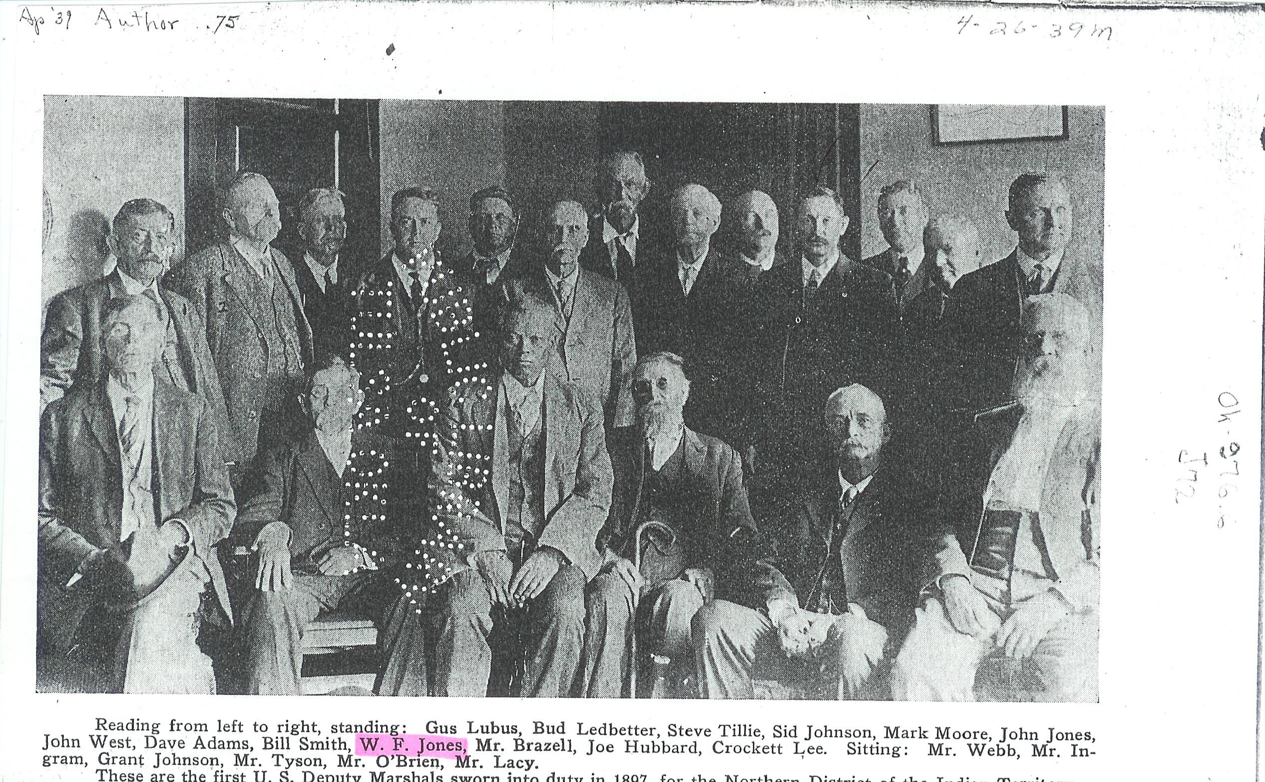 Picture of the first U.S. Deputy Marshals sworn into duty in 1897, for the Northern District of the Indian Territory. W.F.Jones (William Francis) He is one of my ancestors