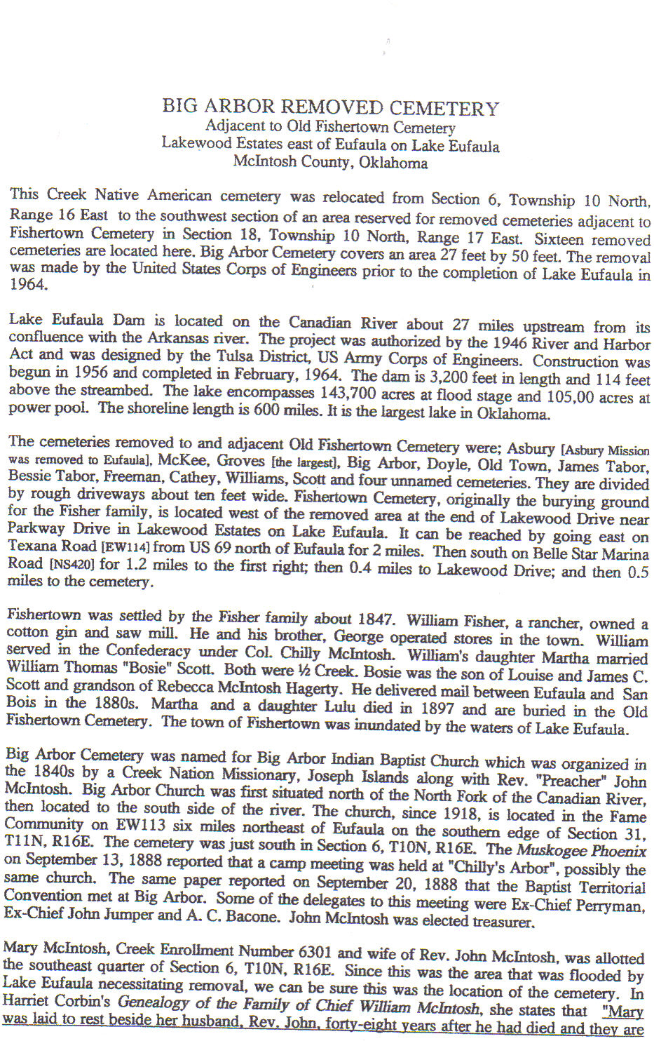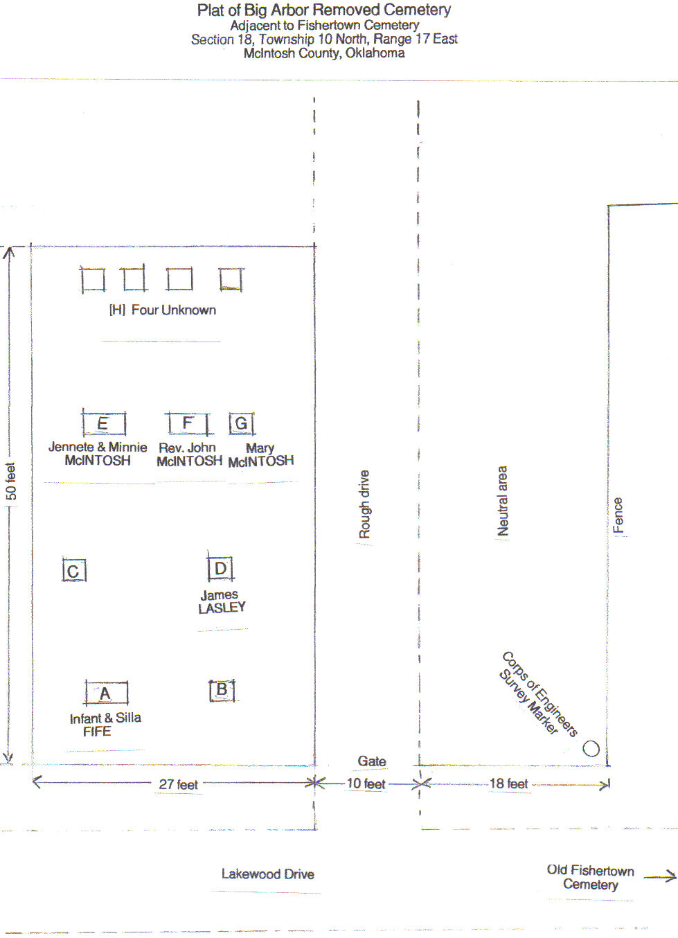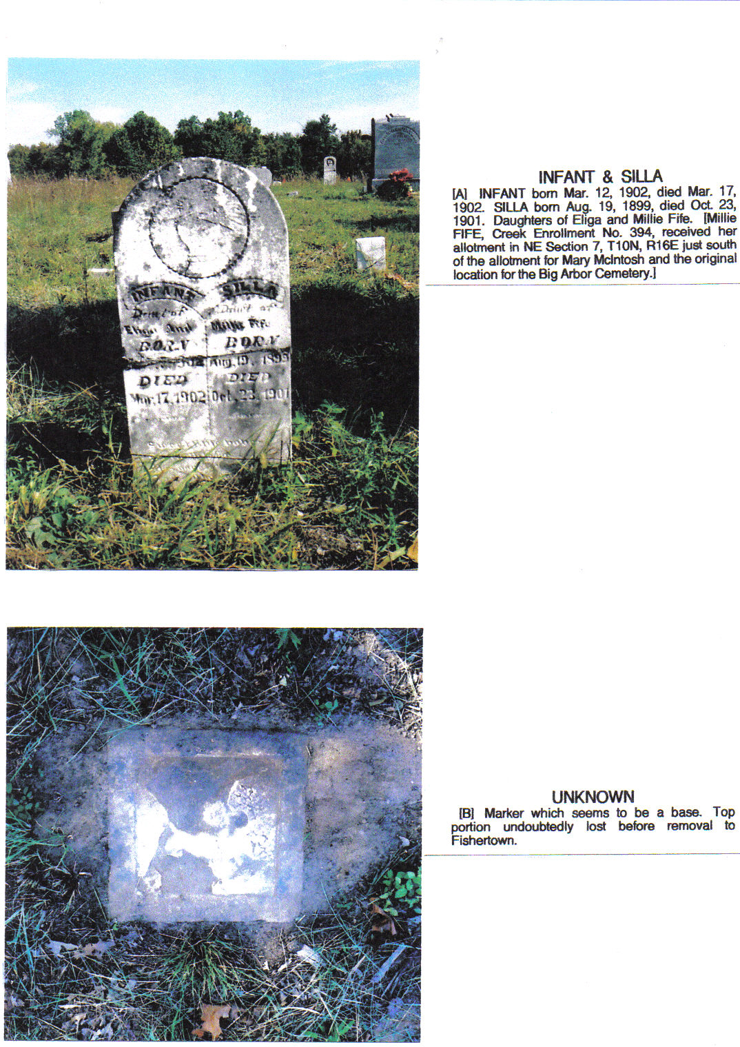 BIG ARBOR CEMETERY (McIntosh County, Oklahoma) This cemetery was located in McIntosh County, Oklahoma, in Sec. 6, TlON, R16E. There were about six unknown graves Reinterment was made adjacent to Fishertown Cemetery in McIntosh County, Oklahoma, in Sec. 18, T10N, R17E. Fife, Baby 12 Mar 1902 17 Mar 19O2 Fife, Silla 14 Aug 1899 23 Oct 1901 Lasley, James ---- ---- Lasley, Sam (Infant) ---- ---- McIntosh, Jennete 15 Oct 1891 13 Sep 1909 McIntosh, John, Rev. 11 Aug 1833 25 Dec 1906 McIntosh, Mary ---- ---- McIntosh, Minnie 15 Feb 1894 25 Nov 1909 R. S. (Initials only) ---- ---- |