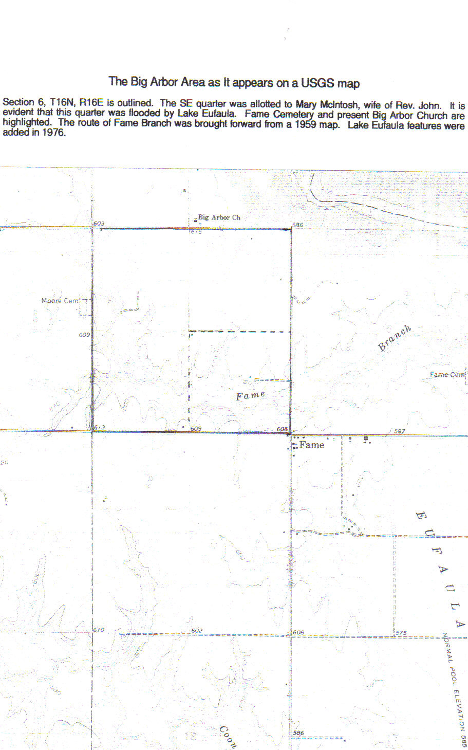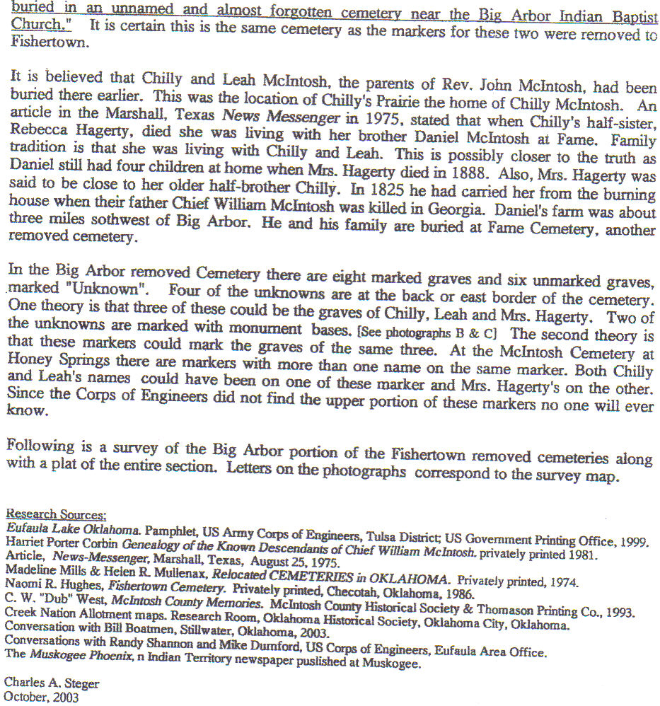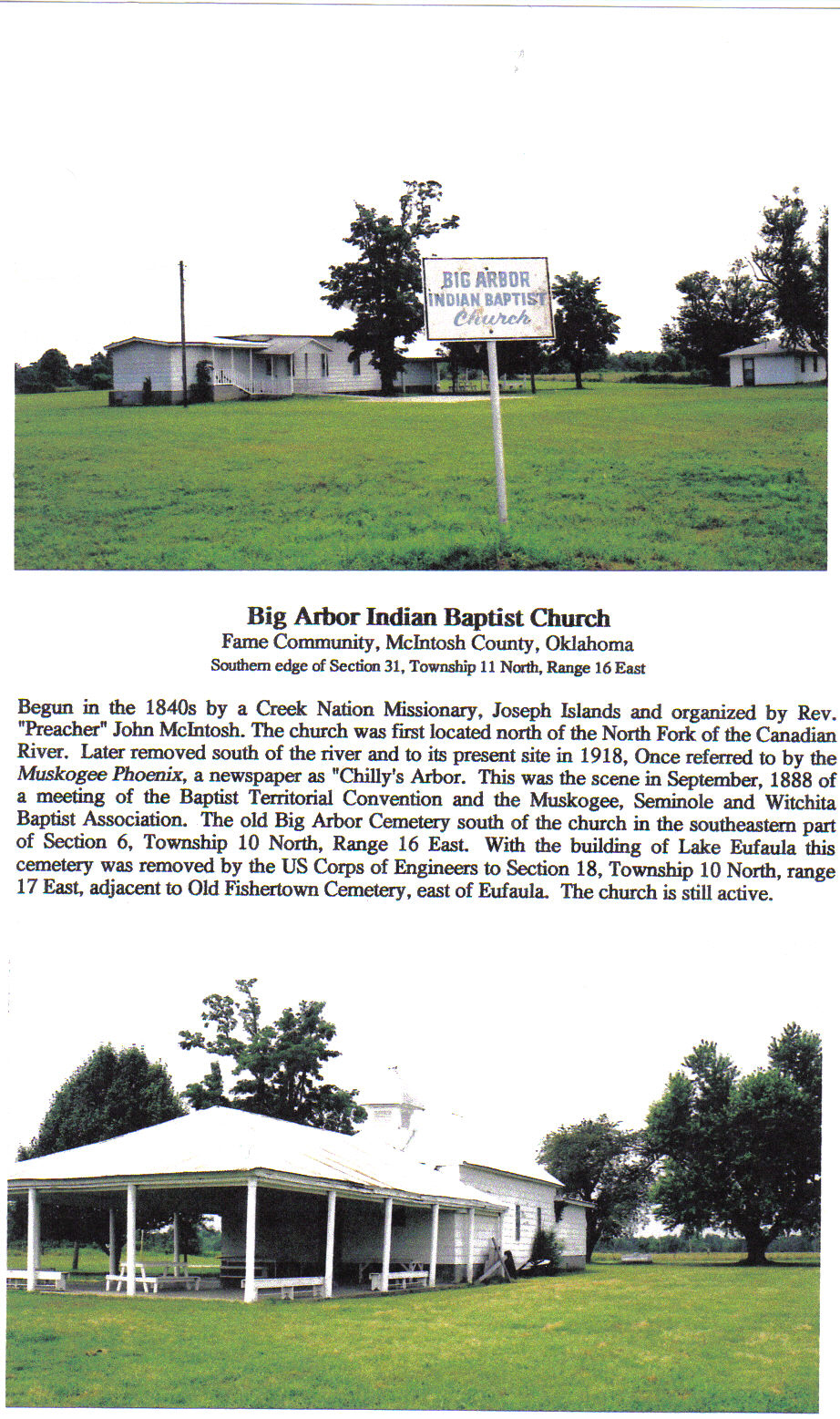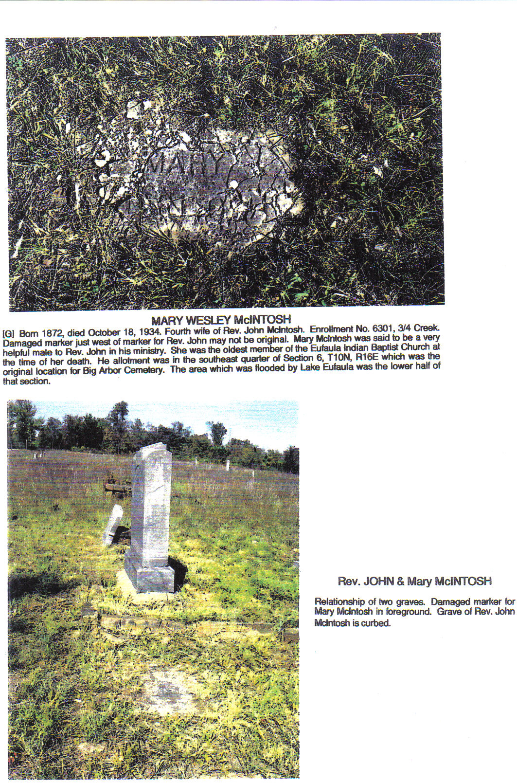 BIG ARBOR CEMETERY (McIntosh County, Oklahoma) This cemetery was located in McIntosh County, Oklahoma, in Sec. 6, TlON, R16E. There were about six unknown graves Reinterment was made adjacent to Fishertown Cemetery in McIntosh County, Oklahoma, in Sec. 18, T10N, R17E. Fife, Baby 12 Mar 1902 17 Mar 19O2 Fife, Silla 14 Aug 1899 23 Oct 1901 Lasley, James ---- ---- Lasley, Sam (Infant) ---- ---- McIntosh, Jennete 15 Oct 1891 13 Sep 1909 McIntosh, John, Rev. 11 Aug 1833 25 Dec 1906 McIntosh, Mary ---- ---- McIntosh, Minnie 15 Feb 1894 25 Nov 1909 R. S. (Initials only) ---- ---- |