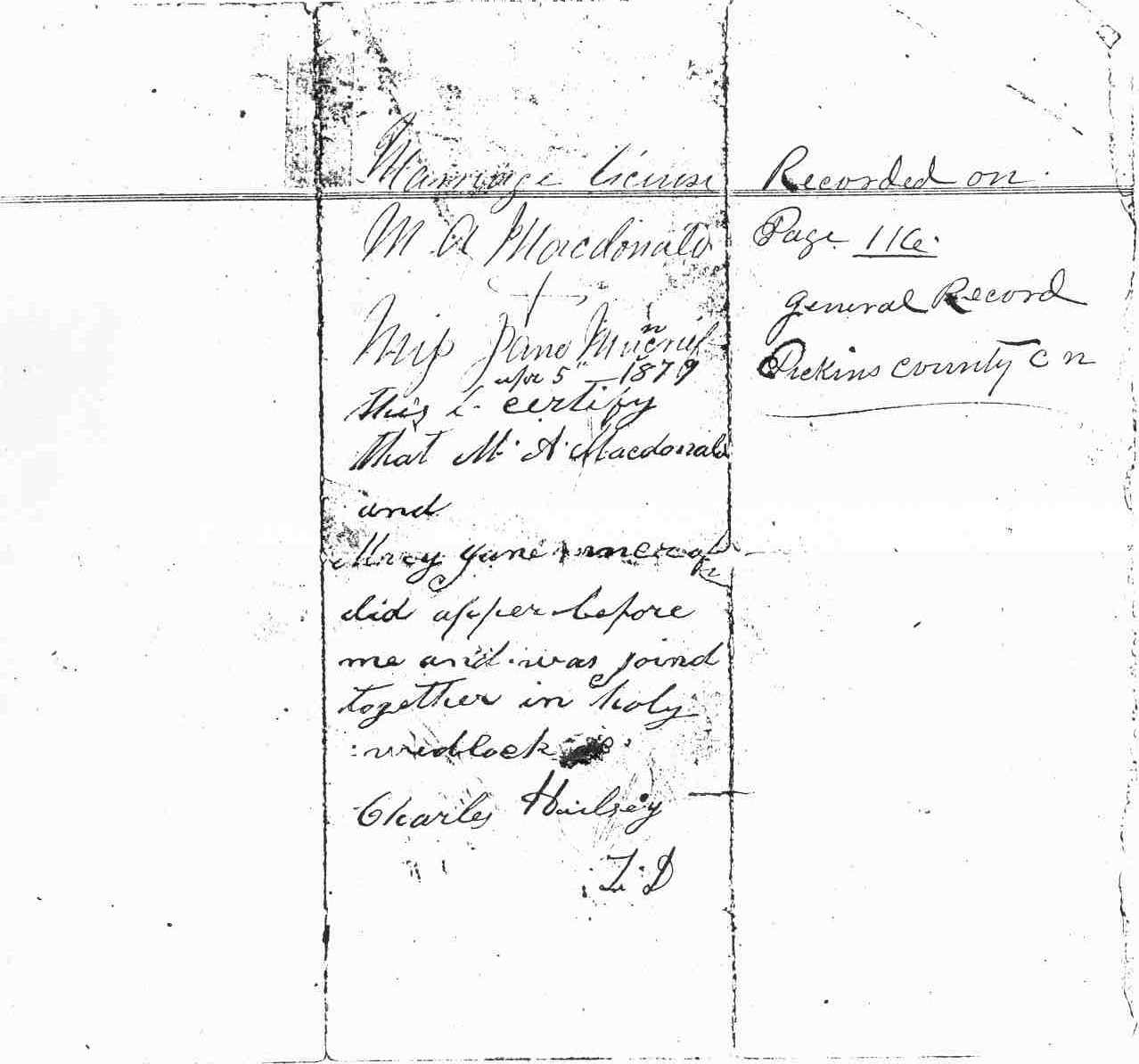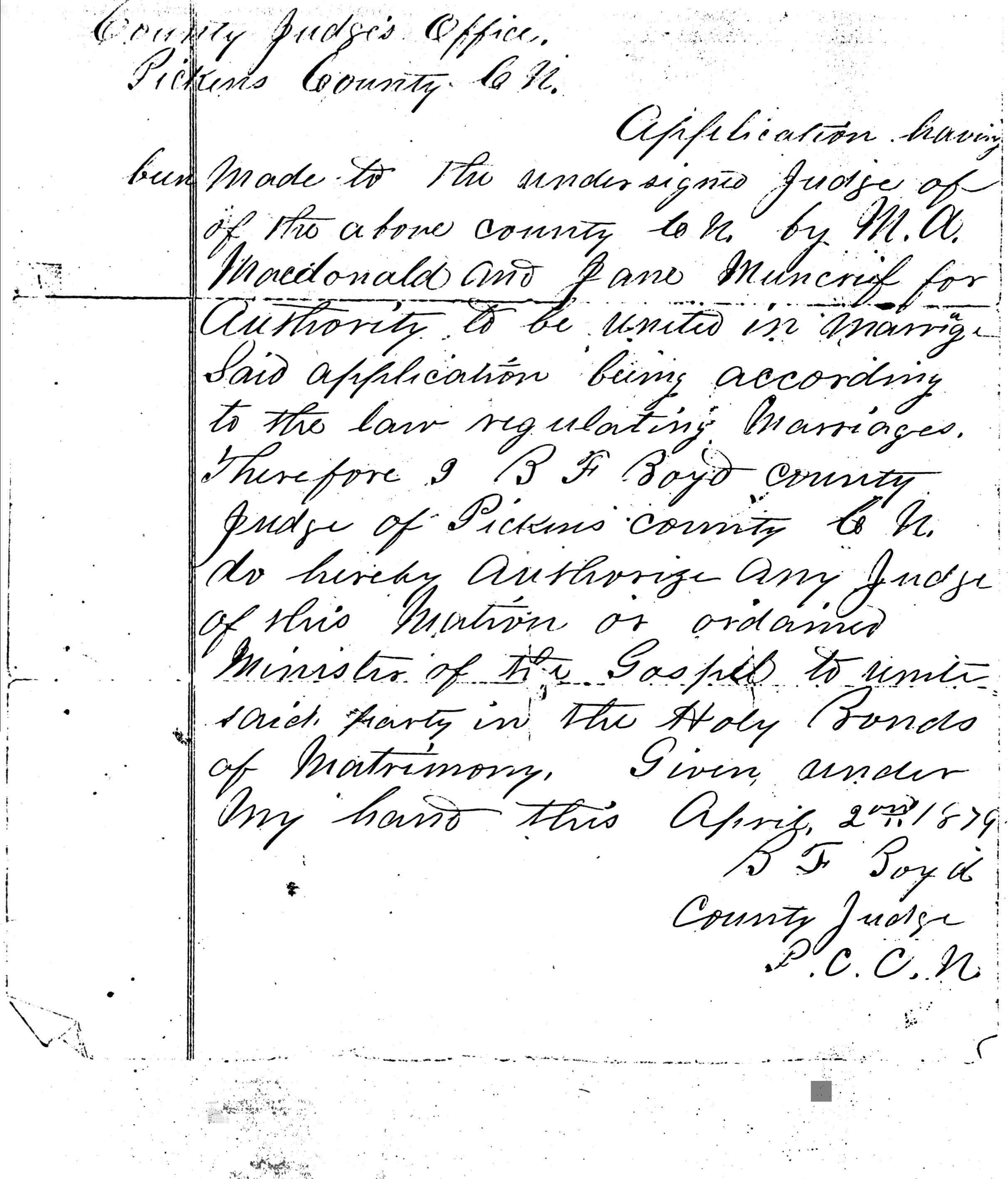 Muncrief / McDonald 1879 Marriage License Pg 2