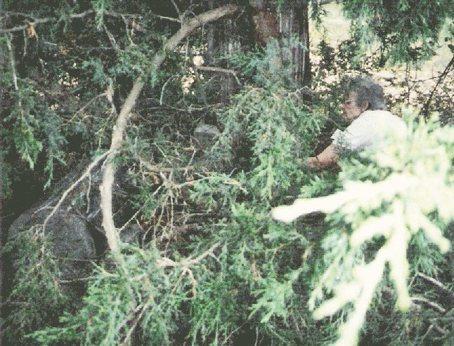 Bessie Jones, mother of Jeannie Inman holds back branches from the cedar