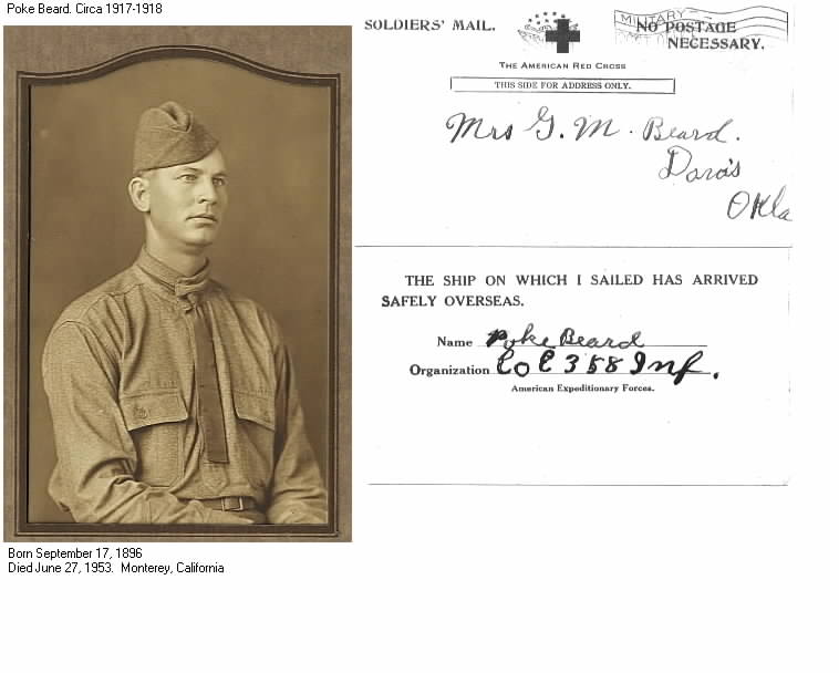 OklahomaPVT CO H 357 Infantry World War I Death dates on the two markers disagree. Printed in The Davis News on Feb. 6, 1919; Reprinted with permission Frank Beard Arrives Home Pvt. George F. Beard, of Co. H, 357th Inf., returned Saturday to his home in Davis from Camp Pike, Ark., where he received his honorable discharge from Uncle Sam's service. He left Camp Travis, Texas, June 10th, 1918, for oversea and landed in France and was soon up to the front, but took the trench feet about two hours before time to go over the top, and was placed in the hospital. Frank landed in New York Dec. 11 and says he wouldn't take anything for the trip but isn't at all anxious to go back. His mother, Mrs. L.V. Beard says she is very thankful that one of her sons returned home in as good condition as he is. She has two more sons in the service. Frank is the oldest of the three. Mrs. Beard received a letter Sunday from her son Willie Beard, M. G. Co., 142 Inf., and he was still in France enjoying good health and thinks he may get home in March. She hasn't heard from her son, Corp. Poke Beard, since Dec. 9th when she received a telegram saying he was wounded on Oct. 4th. George Frank Beard Born Feb 25, 1887 - Died May 1969 |