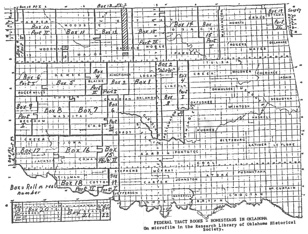Map Federal Tract Books - Homesteads in Oklahoma http://www.okgenweb.net/~land/oktrctbks.gif |