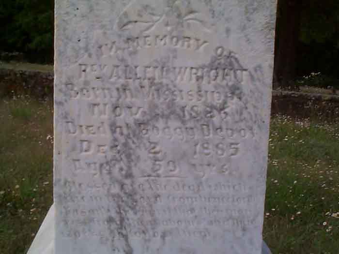In memory of Rev. Allen Wright, Born in Mississippi Nov. 1825, Died at Boggy Depot Dec. 2, 1885, Age 59 yrs. |