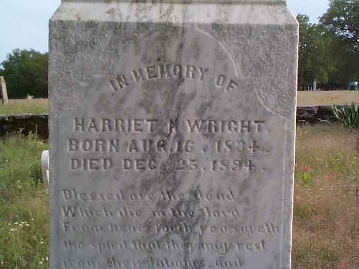In memory of Harriet N. Wright, Born Aug. 16, 1834, Died Dec. 25, 1894 |