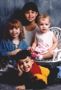 | These four beauties are my Grandchildren. Far back is Kristi, my oldest at 9 years old and Cody lying in front is my only grandson. Both belong to my daughter, Kimberly. The blue eyed baby (middle right) is the new addition to our family. Her name is Taylor and she belongs to my son, Jimmy. Her sister Ashley is sitting next to her.