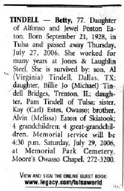 TINDELL - Betty, 77. Daughter of Alfonso and Jewel Poston Eaton. Born September 21, 1928, in Tulsa and passed away Thursday, July 27, 2006. She worked for many years at Jones & Laughlin Steel. She is survived by: son, Al (Victoria) Tindell, Dallas, TX; daughter; Billie Jo (Michael)Tindell Bridges, Trenton, IL; daughter, Pam Tindell of Tulsa: sister, Kay (Carl) Estes, Owasso; brother, Alvin (Melissa) Eaton of Skiatook; 4 grandchildren; 4 great-grandchildren. Memorial service will be 4:30 p.m. Saturday, July 29, 2006, at Memorial Park Cemetery. Moore's Owasso Chapel 272-3200.