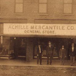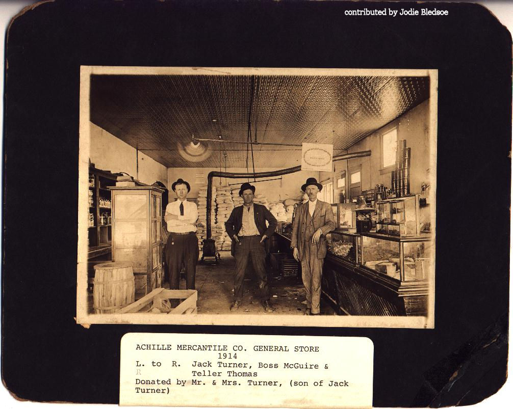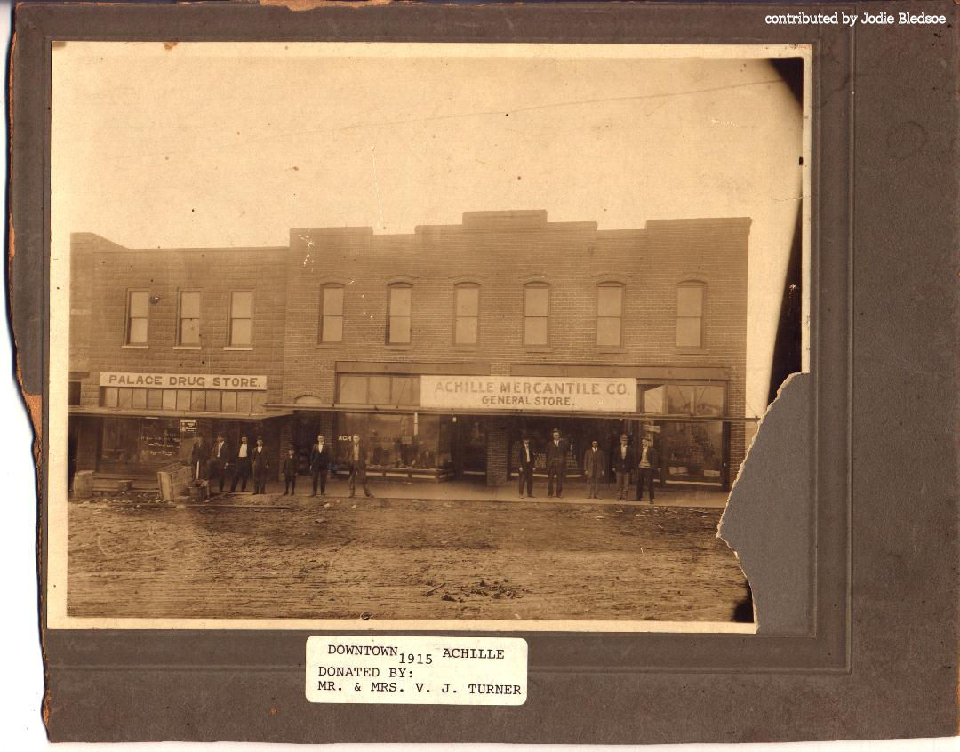 Achille is located twelve miles south of the county seat of Durant and at the intersection of State Highways 78 and 91. Three miles southeast of present-day Achille the Methodist Episcopal Church had opened the Bloomfield Academy for Chickasaw girls in 1853. At that time the area was located in the Chickasaw Nation, Indian Territory. The community developed after the Missouri, Oklahoma and Gulf Railroad built a line from Calvin (Hughes County, Oklahoma) to the Red River in 1908 10. A post office, designated as Achilla, was established on June 10, 1910. The name was changed to Achille on August 5, 1910. According to historian George H. Shirk, the moniker is a corruption of a Cherokee word, atsila, meaning fire. During the Civil War (1861-65) Cherokee refugees had located in the area and called it atsila. Surrounded by fertile land, farmers produced cotton and corn. By 1911-12 Achille had an estimated population of fifty. Residents had organized Baptist and Methodist Episcopal churches and supported three general stores, a bank, a meat market, a lumberyard, a cotton gin, and two physicians. In 1918 the community, with an estimated six hundred citizens, was served by the Achille Telephone Company and the weekly Achille Press published by J. H. Lindsay. Also, at that time a second cotton gin was operating. The first federal census for Achille reported 500 inhabitants in 1920. The censuses for 1930, 1940, and 1950 indicated populations of 383, 356, and 383, respectively. In the 1930s in addition to agricultural pursuits an iron foundry provided employment. During the 1940s and 1950s several gas stations and grocery stores, a lumberyard, and a cotton gin continued to serve the populace. By 1960 the census numbers declined to 294, and the railroad line was abandoned on May 8, 1965. Since that time Achille has seen an increase from 382 residents counted in 1970 to an official peak number of 506 tabulated in 2000. At the turn of the twenty-first century the Achille school system, serving a dispersed rural area, had an enrollment of 501 in grades prekindergarten through twelve. Of those employed 95.3 percent commuted to work in larger urban centers.