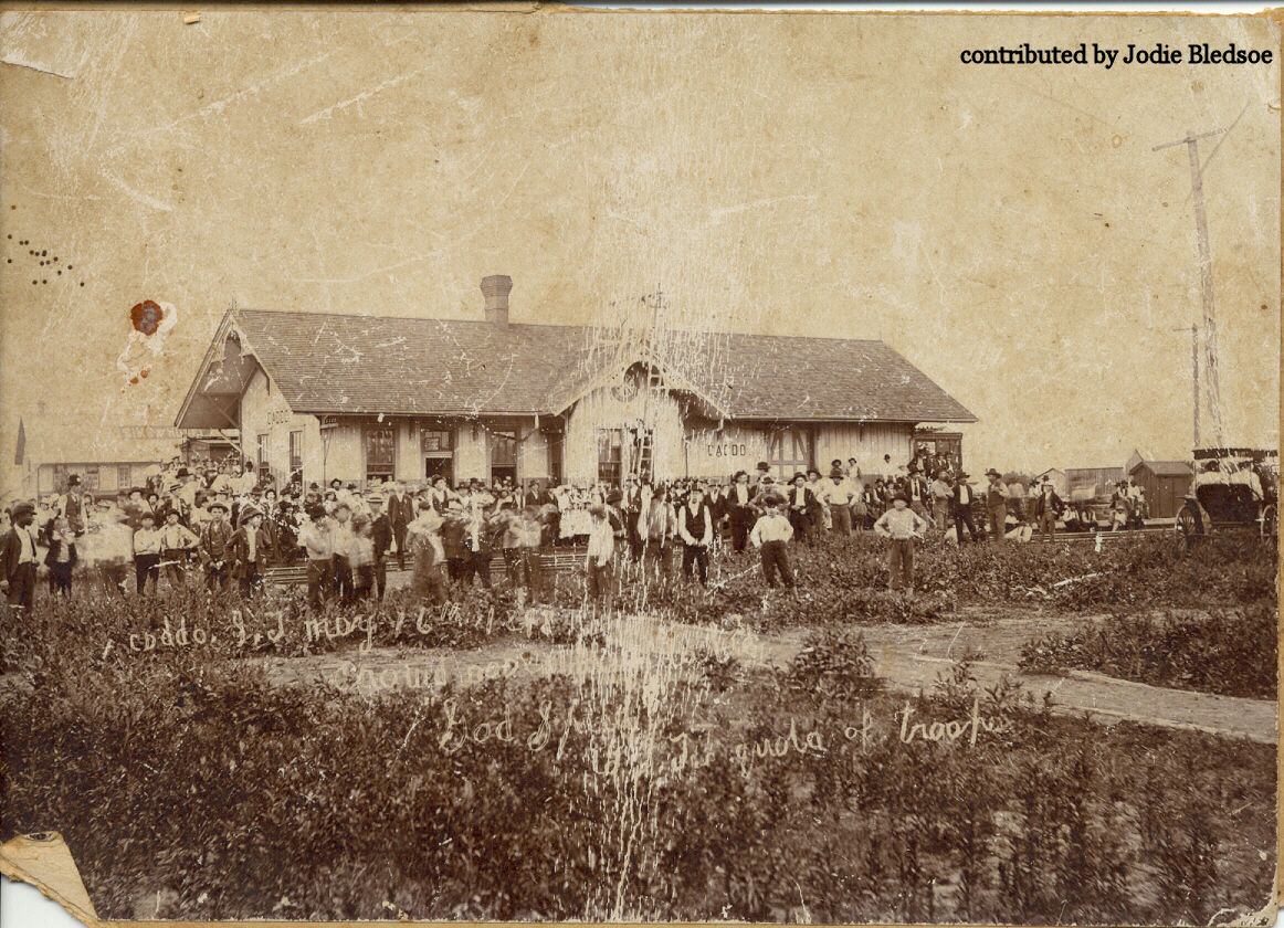 Caddo is located in north central Bryan County, Caddo is north of Durant on U.S. Highways 69 and 75, approximately two miles south of the Atoka County border on a branch of the Blue River. The town was named for the nearby Caddo Hills, site of an 1808 battle between the Caddo and Choctaw, in a low range of hills two miles southeast of the town. The engagement was a major defeat for the Caddo. The area was formally part of the Choctaw Nation. Caddo is the oldest town in Bryan County. The Choctaw Nation originally used the site as a court town, and on the first Monday of each month they gathered at the site to air complaints or to stand trial. The location became a stopping place on the trail between Fort Smith and Fort Sill. Maj. Aaron Harlan built a store nearby. Caddo owed its growth to the Missouri, Kansas and Texas Railway (MK&T, or Katy), which built a line through the Choctaw Nation in 1872. Katy engineer Ben Munson staked out Caddo Station. In October 1872 Big John Scullin and his Irish laborers laid the first track into the site. A post office was established December 19, 1872, with W. S. Burke as postmaster. Aaron Harlan's wife, Sarah Ann, helped found the First Methodist Church in 1873. By 1873 about four hundred people had clustered around the depot. The rapid population influx meant that some residents had to live in tents. Caddo was a communications hub in early years. The community soon served as a freighting and trade center for a surrounding important ranching and farming area. Crops included corn, oats, sugarcane, and cotton, and processing facilities at one time included five cotton gins. In 1874, according to the Oklahoma Star, Caddo boasted three general stores, attorney C. J. Harkins, physician A. D. Folsom, photographer U. M. Cooper, Dr. J. B. Jones, a boot repair shop, a meat market, a blacksmith, a drugstore, and many other businesses. In 1890 the town claimed to have the largest cotton market in the territory. By 1890 the population had grown to 2,170. Incorporated in 1898, Caddo appeared to be the most populous and promising town in the region. One of its most successful citizens was merchant and noted cattle raiser Wilson Nathaniel Jones, later chief of the Choctaw. When the St. Louis and San Francisco Railway began to build an east-west line across the Katy tracks, the merchants raised land prices, causing the railroad officials to decide to build the tracks through Durant. This made Durant the fastest growing city, and it became the county seat. Caddo was left behind. Six miles southwest of Caddo lay an area of oil and sulphur springs that served as a resort for southeastern Oklahoma at the turn of the twentieth century. Peter Maytubby operated a health resort at Maytubby Springs. The Choctaw called the springs' waters "God's medicine," and sophisticated townspeople thought the liquid conducive to good health. In 1930 Caddo's population stood at 933 but slowly dropped to 814 in 1960. In 1973 the town celebrated its centennial. Planning committee chairperson was favorite son James Pinckney "Cowboy Pink" Williams, a lieutenant governor and state treasurer. At the end of the twentieth century Caddo's major industries included ranching operations and one of the state's largest fish hatcheries. The 2000 census recorded a population of 944.