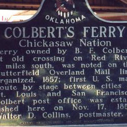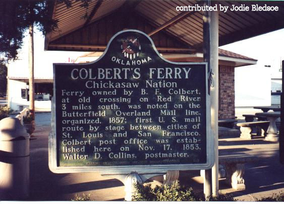Colbert lies on State Highway 91, near its intersection with U.S. Highway 69/75. The establishment of Fort Washita in 1844 and Armstrong Academy in 1850 preceded Colbert's founding. A post office was established with Walter D. Collins as postmaster on November 17, 1853. The town's name honored Benjamin Franklin Colbert of the Colbert family, descendants of a Scottish family who had intermarried into the Chickasaw Nation. In 1848 Colbert moved to the area to build a home on the Red River. A wealthy cotton farmer, he owned twenty-five slaves. In 1853 he secured permission from the tribe to run a ferry across the Red River. In 1858 the community became a stop for the Butterfield Overland Mail. Colbert agreed to transport the stages and passengers over the river for free and to maintain the road. The line stopped first at Nail's Crossing on the Blue River and then at Carriage Point or Fisher's Station, named for Fisher Durant, the Choctaw who ran the station, before entering Colbert from the west. The ferry operated until B. F. Colbert later sold his interest in the ferry to the Red River Bridge Company. At the ferry site in 1892 the company completed a toll bridge, but it was destroyed by a flood in 1908. In 1915 the company rebuilt the bridge and by the 1920s charged seventy-five cents per vehicle. Later, a proposal for a free bridge occasioned the Red River Bridge War. Because of a federal injunction filed by the Red River Bridge Company against the Texas Highway Commission, Texas Gov. William W. Sterling ordered the Texas Rangers to prevent the opening, prompting Oklahoma Gov. William H. Murray to call out the National Guard. In 1931 the federal courts settled the issue, after the Texas legislature passed a bill that allowed the bridge company to sue the state. In 1872 the Missouri, Kansas, and Texas Railway, or Katy, built through Colbert to Denison, Texas. Attracted by cotton and peanut farming, settlers moved to the area in greater numbers. In 1899 the town was platted by the Dawes Commission. In 1906 the First National Bank was organized by Dr. W. H. McCarley, a physician. The Colbert Times served as the community's newspaper in the 1910s. In 1940 the town had a population of 602, which rose to 671 in 1960, and by 1980 stood at 1,122. Nearby Lake Texoma creates an inflow of tourist dollars to bolster the economy. The Colbert's Ferry site is listed in the National Register of Historic Places