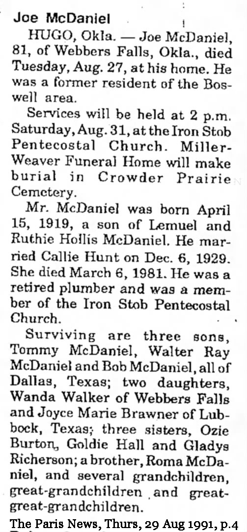 | McDaniel | Joe | 15 Apr 1919 | 27 Aug 1991 | ||||