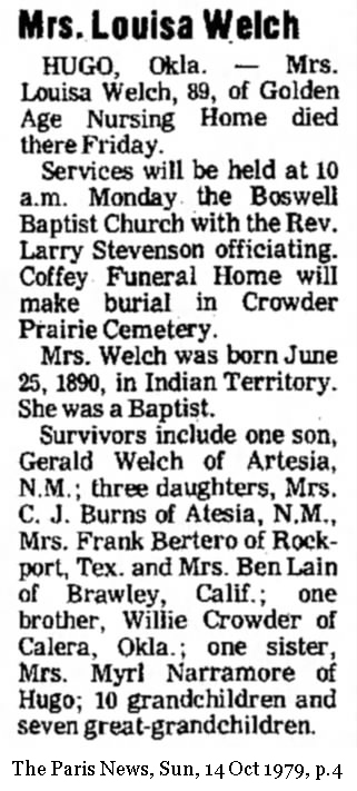| Welch | Louisa | 25 Jun 1890 | 12 Oct 1979 |
