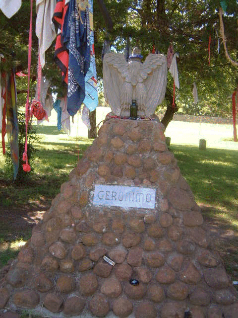 From Interstate 44 at Fort Sill, enter Key Gate. Going west, turn right on Geronimo Road, turn left on Randolph Road, turn right on Quinette Road. Follow "Geronimo Grave" signs. Very well kept. If I have made a mistake in transcribing names and dates, I apologize for it.
