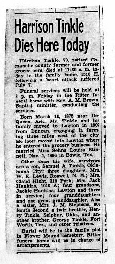 Harrison Tinkle Dies Here Today Harrison Tinkle, 70, retired Comanche County farmer and former grocer here, died at 11:30am today in the family home, 1510 H, following a heart attack suffered July 7. Funeral services will be held at 3pm Friday in the Ritter Funeral Home with Rev. A. M. Brown, Baptist minister, conducting the services. Born March 10, 1875 near DeQueen, Ark., Mr. Tinkle and his family moved to Lawton in 1907 from Duncan, engaging in farming three miles west of the city. He later moved into Lawton where he entered the grocery business. He married Miss Selina Louisa Stinnett, Nov. 1, 1896 in Bowie, Tex. |
