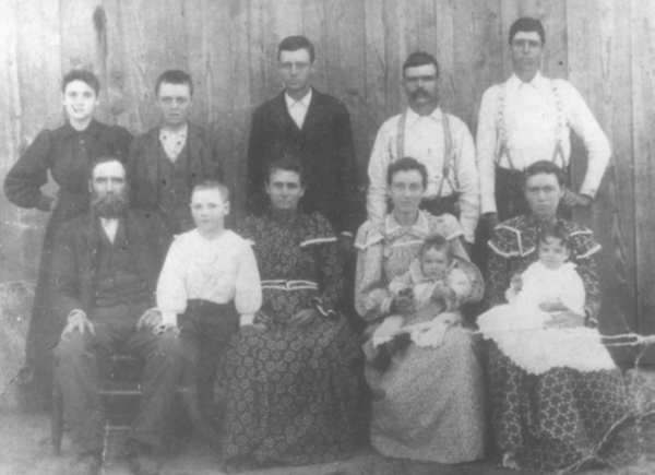 1899 at Illinois Bend, Texas before moving to Fletcher Back Row: Emma Williams Childs, Jim Williams, Joel Williams, Jap Miller, and John Roberts Front Row: John B. Williams, Curg Williams, Margaret Williams, Angie Williams Miller, and Molly Williams Roberts |