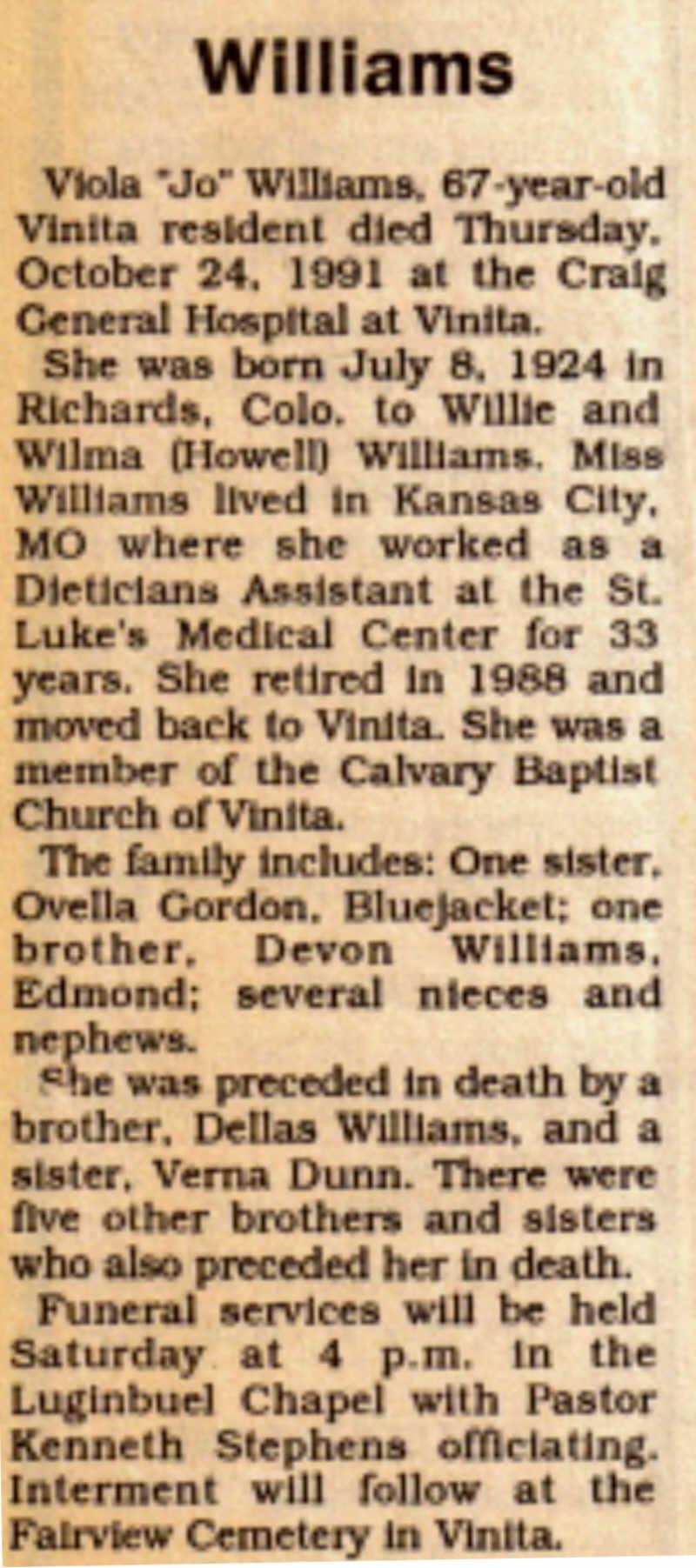 Hello, I don't have an obit on Willie Williams, but I do have one on his daughter, Viola Williams. It comes from volume C, pg 86 of my mother, Eunice Hightower's collection of obit scrapbooks, some of which I have online at the Craig co usgenweb and 7 volumes listed on my FreePages at Rootsweb. The link to that is: http://freepages.genealogy.rootsweb.ancestry.com/~eddene/