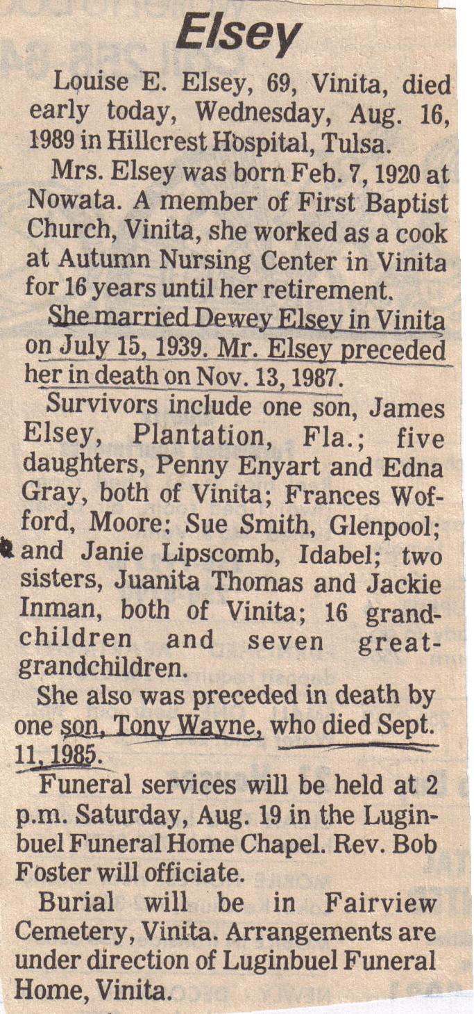 Hello, I'm sorry, but the scanned obit of Dewey Elsey didn't turn out very readable, so I have typed it up. I didn't have a 'date' for the obit, so have looked it up in the Social Security Death Index online. I would suggest looking these children up in an online people search such as Yahoo People Search and perhaps you can find a way to contact them. Good luck. Eddene ---------------- Here is the link to my FreePages at Rootsweb where I have an index to one volume each of weddings and anniversaries as published in the Vinita (Ok) Daily Journal and the seven (7) volumes of obits: http://freepages.genealogy.rootsweb.ancestry.com/~eddene/ ====================== SOCIAL SECURITY DEATH INDEX ONLINE: Name: Dewey E. Elsey SSN: 442-18-2306 Last Residence: 74301 Vinita, Craig, Oklahoma, Born: 5 May 1915 Died: 13 Nov 1987 State (Year) SSN issued: Oklahoma (Before 1951 ) .......... ELSEY