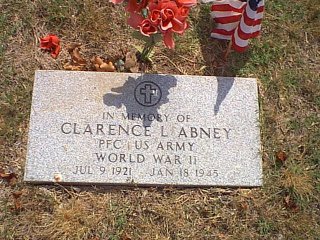 CLARENCE LEON ABNEY was born July 9, 1921, at Stratford, Okla. He graduated from Stratford High School. He began farming out of high school, but WWII had started and he was drafted. He was promoted to Corporal as he was preparing to ship out for overseas. Just prior to going overseas, Clarence married Thelma Motz on Nov. 30, 1943 in Buffalo, New York. Due to a clerical error, Clarence was reverted to PFC in rank after going overseas. His serial number was 38272175. He was assigned to the 12th Armored Division, known as the Hellcats. According to their history, they shipped out of Camp Shanks, New York and sailed for England on 20 September 1944. According to the history of the unit, their battalion engaged in combat on December 5, 1944 near Weislingen. They captured a German town at Utweiler on 21 December 1944. Clarence was killed on 18 January 1945, which was the day his unit engaged in the battle for Herrlisheim, France, a small town north of Strasbourg. Because of their heavy casualties, this became known as "Bloody Herrlishem". Quoting from "The Story of the 12th Armored Division - WWII G.I. Story Book": "This was their only defensive battle of the war when they smacked into a numerically superior and well-entrenched enemy. But while sustaining many casualties, the Hellcats thwarted repeated German attempts to break out of the river head pocket and strike south toward the political prize of Strasbourg. It was here that the 12th was dubbed the "Suicide Division" by the Germans, who eventually withdrew, still puzzled by American tenacity. Later, according to the Nazi POWs, the Hellcats became one of the two most feared divisions on the western Front. The other being the 4th Armored." According to a witness from Stratford, Oklahoma who was also in the invasion, a bomb landed directly in the fox hole where Clarence was, killing him instantly. He is buried in the Epinal American Cemetery, Vosges, France, Plot A, Row 21, Grave 71. However, he also has a marker in the Abney Cemetery, Stratford, Okla. His rank is listed as PFC. He was awarded the Purple Heart. Clarence and Thelma had no children.