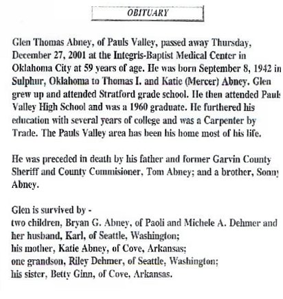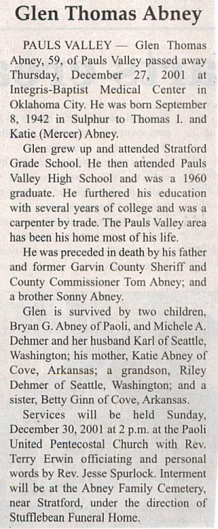 GLEN ABNEY died on December 27, 2001 at Baptist Intregis