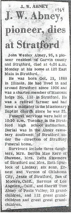 WESLEY ABNEY JOHN WESLEY ABNEY, born Oct. 13, 1869 in Saline County, Illinois. He died Nov. 30, 1964 at Stratford, Oklahoma. He was known by most as "J.W." but his wife called him "Wes". He was an ordained Missionary Baptist preacher. He held three degrees in the Masons at the Stratford, Oklahoma lodge. He worked as a farmer to support the family and handled revival services and pastored several churches in Oklahoma throughout his life. He also traded properties and did various types of labor after he quit farming. He owned and operated a grocery store in the Prairie Grove Community, west of Stratford, Oklahoma. After the death of their youngest son, Clarence, in WW II, he renamed the church Clarence Chapel. He was active up to a short time before his death. According to Ruth Abney-Spurlock, J.W. had almost no formal education. His wife taught him to read and write. When he was saved, J.W. joined the Missionary Baptist, although his mother was a Primitive Baptist.