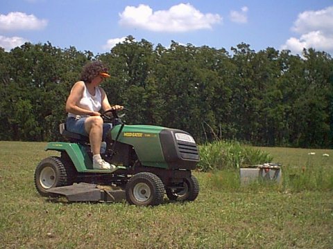This is my sister, Bobbie, mowing the cemetery on May 27, 2001. She doesn't know I took this picture and she'll kill me if she sees it! She is just coming to William Riley Gray's stone. |