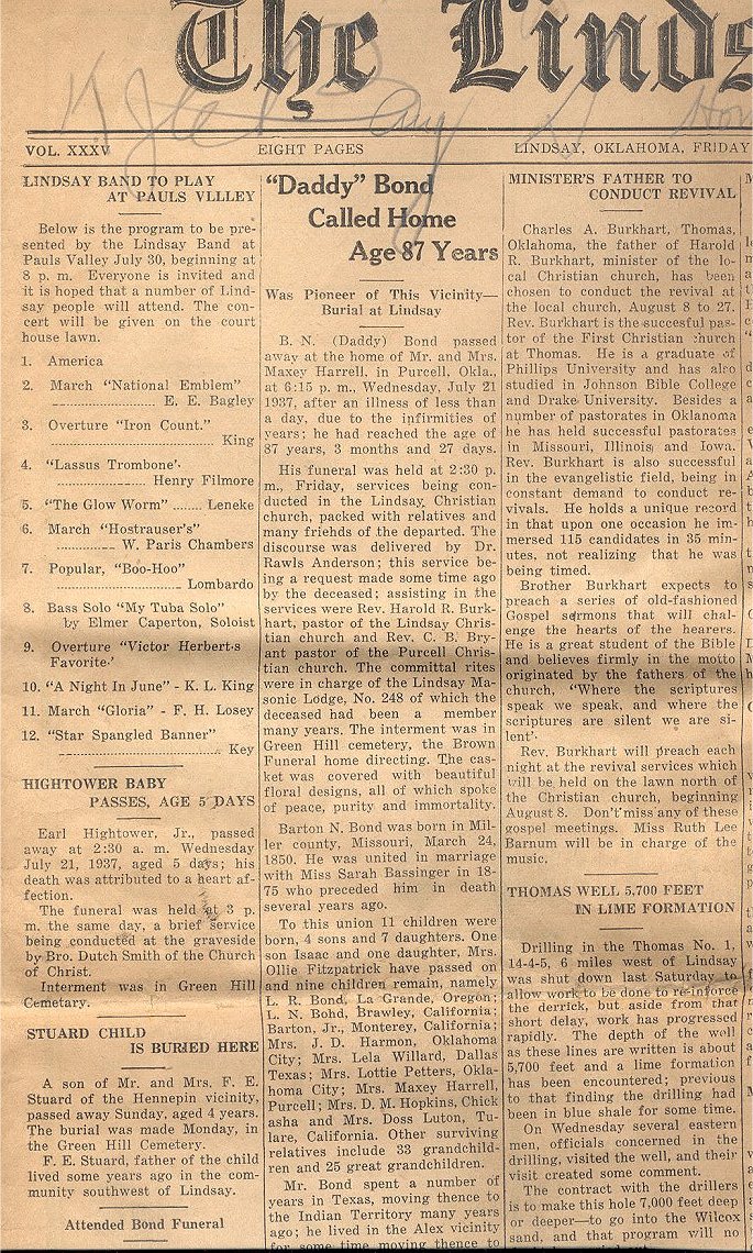B.N. Bond Obit, Baby Stuard Obit, Earl Hightower Obit, Burkhart news