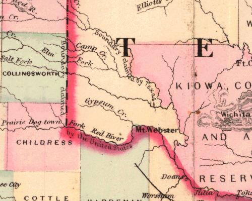 Right: [part of] 1883 Texas and the Indian Territory from Historical Maps of Texas Dated and published 1883 by O.W. Gray and Son, from The National Atlas Note the two "claimed boundaries". |