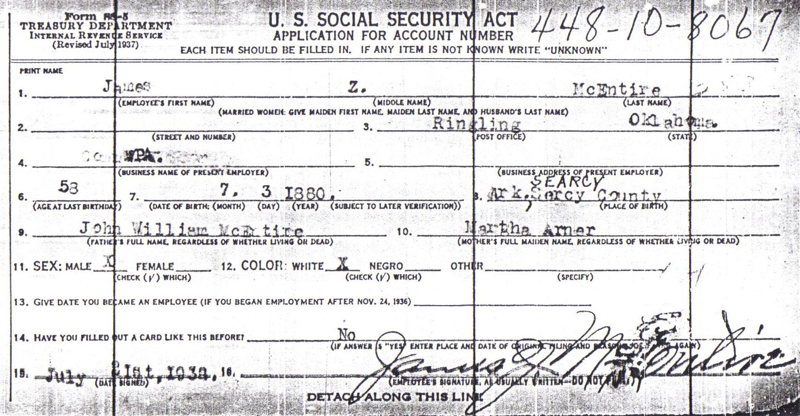 James Z. McEntire's parents were John W McEntire, born 1855 in Ark. according to the 1880 Searcy Co. Ark. census, and Martha R McEntire born also around 1855 in Ark. She was Martha Rachel Arner McEntire.