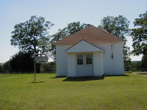 Center Hill Church. The cemetery is behind the church. The church also has a covered outdoor seating area with pews facing the cemetery. |