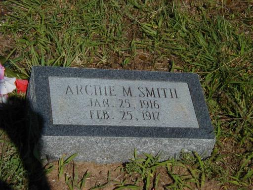 Smith, Archie M - Buried next to Ida Mae and Mark M Smith. He was 2 years and one month old when he died.