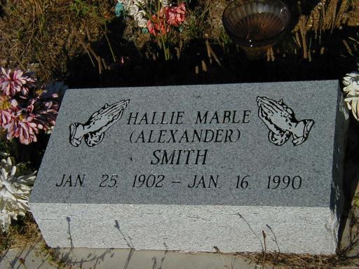 Smith, Hallie Mable (nee Alexander) - Buried next to Nellie Alexander. She is the daughter of James Alexander and Eliza Ann Powers Teresa Young