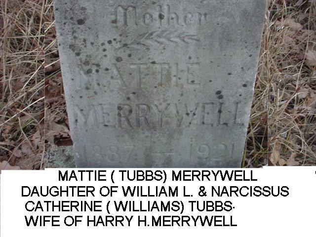 Mattie (Tubbs) Merrywell 1887 ~ 1921 wife of Harry H. Merrywell daughter of William L. & Narcissus Catherine (Williams) Tubbs |