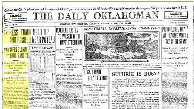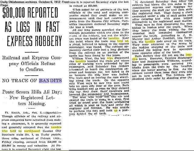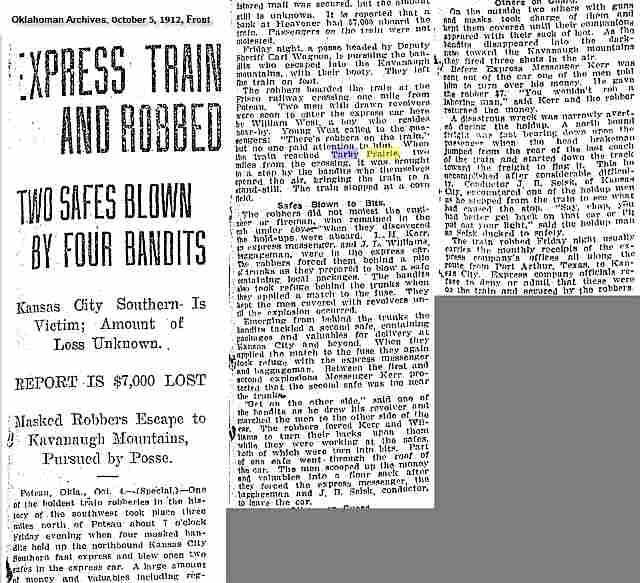 The Daily Oklahoman Oklahoma City, Oklahoma October 6, 1912 p 1 $80,000 Reported As Loss In Fast Express Robbery Ft. Smith, Ark., Oct 5 (Special) ...bandits who held up northbound Kansas City Southern train No. 4, on Tarby Prairie, three miles northeast of Poteau, Okla., Friday evening... All day long posses searched the Kavanaugh mountains which are close to the scene of the robbery... William West, the boy who discovered the bandits boarded the train and whose cries of warning were unheeded by the passengers...J. M. Murray and Arthur Deshiort, two farmers, [said] the bandits rode away on the train... On October 5 & 6, 192 the Oklahoman's front page headline looked like this: