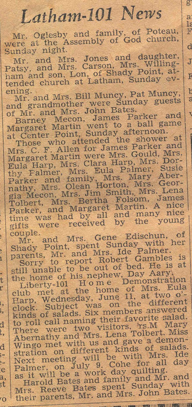 Those who attended the shower of Mrs. C. F. Allen for James Parker and Margaret Martin were Mrs. Gould, Mrs. Eula Harp, Mrs. Clara Harp, Mrs. Dorthy Palmer, Mrs. Eula Palmer, Susie Parker and family. Mrs. Mary Abernathy, Mrs. Olean Horton, Mrs. Georgia Mecon, Mrs. Jim Smith, Mrs. Lena Tolbert, Mrs. Bertha Folsom, James Parker and Margaret Martin. A nice time was had by all and many nice gifts were received by the young couple. Mr. and Mrs. Gene Edischun, of Shady Point, spent Sunday with her parents, Mr. and Mrs. Ide Palmer. Sorry to report Robert Gables is still unable to be out of bed. He is at the home of his nephew, Day Aary. Liberty-101 Home Demonstration club met at the home of Mrs. Eula Harp, Wednesday, June 11, at two o'clock. Subject was on the different kinds of salads. Six members answered to roll call naming their favorite salad. There were two visitors, Mrs. M. Mary Abernathy and Mrs. Lena Tolbert. Miss Wingo met with us and gave a demonstration on different kinds of salads. Next meeting will be with Mrs. Ide Palmer on July 9. Come for all day as it will be a work day quilting. Harold Bates and family and Mr. and Mrs. Reeve Bates spent Sunday with their parents, Mr. and Mrs. John Bates. |