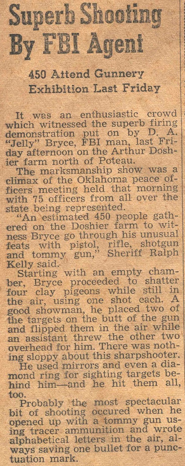 It was an enthusiastic crowd which witnessed the superb firing demonstration put on by D. A. "Jelly" Bryce, FBI man, last Friday afternoon on the Arthur Doshier farm north of Poteau.