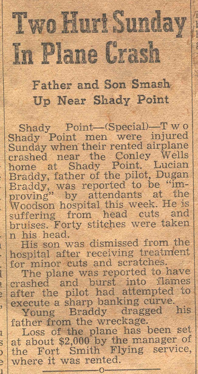 Shady Point - (Special) Two Shady Point men were injured Sunday when their rented airplane crashed near the Conicy Wells home at Shady Point. Lucian Braddy, father of the pilot, Dugan Braddy, was reported to be "improving" by attendants at the Woodson hospital this week. He is suffering from head cuts and bruises. Forty stitches were taken in his head.
