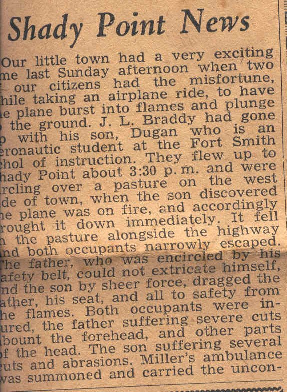 Our little town had a very exciting time last Sunday afternoon when two of our citizens had the misfortune, while taking an airplane ride, to have the plane burst into flames and plunge to the ground. J. L. Brady had gone __ with his son, Dugan who is an aeronautic student at the Fort Smith School of instruction. They flew up to Shady Point about 3L30 pm and were __reling over a pasture on the west side of town, when the son discovered the plane was on fire, and accordingly brought it down immediately. It feel in the pasture alongside the highway and both occupants narrowly escaped. The father, who was encircled by his safety belt, could not extricate himself, and the son by sheer force, dragged the father, his seat, and all to safety from the flames. Both occupants were injured, the father suffering severe cuts about the forehead, and other parts of the head. The son suffering several cuts and abrasions. Miller's ambulance was summoned and carried the uncon__ [ends]