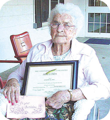Ms. Dessie L. Taylor Owen, a resident of the Spiro Nursing Home, was inducted Sept. 5 into the Centenarian Club of Oklahoma by the KEDDO Area Agency on Aging of Wilburton. She was presented with a Centenarian Certificate, a Golden Okie pin and a Guardian Angel pin.