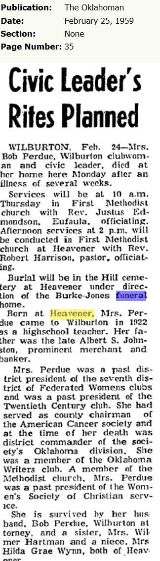 She is survived by her husband. Bob Perdue. Wilburton attorney,