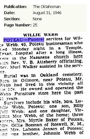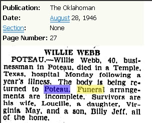 Burial was in Oakland cemetery.  Born in Gilmore, near Poteau, Mr. had lived in this vicinity all his life. He owned and operated the Webb furniture store here the past 21 years.