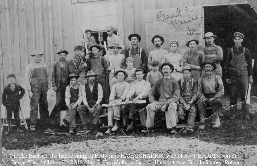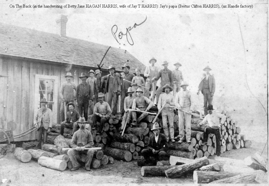 [on the back in the handwriting of Betty Jane (Hagan) Harris, wife of Jay T. Harris, son of Bertus "Bert" Clifton Harris) is written: Jay T. Harris's Papa, Bert C. Harris at Axe Handle Factory, Poteau