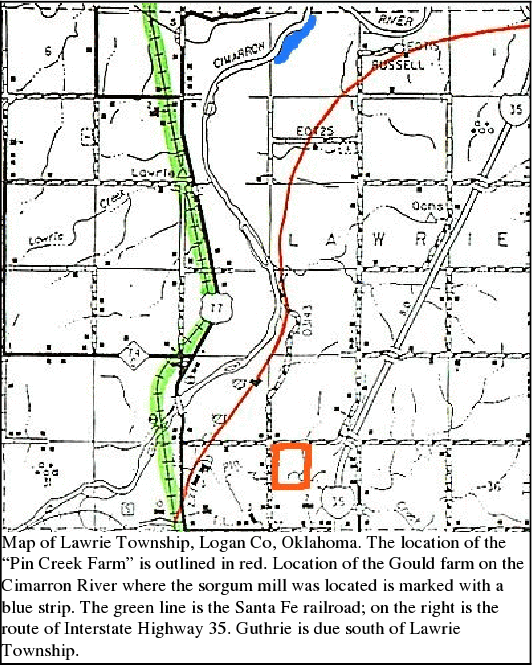 In 1889 Dad's family (except Adaline who had married John Gier of Conrad) moved to the "Pin Creek Farm" near Guthrie, Oklahoma. Oklahoma was then a territory of the United States. This was a one hundred sixty acre farm, the principal crops being sorghum care and wild fruit trees, plums and peaches and lots of wild turkeys. They hauled the cane five miles north of Guthrie to the "Gould" farm on the Cimarron River which had a sorghum mill. Dad relates that on one of the trips he and Grandpa had to stay over night at the Gould farm because heavy rains had swollen the Cimarron and it was too deep to ford back across (no bridges in those days. Anyway, Dad says he remembers this so clearly because the Goulds had five girls and no extra bed for him and that he had to sleep with two of the girls. (sounds like a traveling salesman deal)The family lived on Pin Creek farm for five years. During this time it was rough going. There were no schools, no roads, no fences, no nothing; but a one room school was finally built in 1892 next to the Pin Creek farm on land Grandpa donated and Dad started to school at the age of twelve years.1 It was during this period that the U. S. Government opened up the Cherokee Strip. The line started south of Stillwater and was one hundred miles wide and four hundred miles long. This was land "free for the taking," but everyone had to start from the line by a signal from the authorities. 1 - 1892 Business and Resident Directory Embracing an Index of Residents in Guthrie, together with the names of all Homesteaders in Logan County, giving quarter section, township and range. For the Year Commencing September 1st, 1892. TITUS E Y, Co Supt of Public Ins, room 33 Com blk, r nw 1-4 sec 34-17-2 (He lived on the northwest quarter of Section 34, Township 17N, Range 2W, Lawrie Township) Page 1 of 9