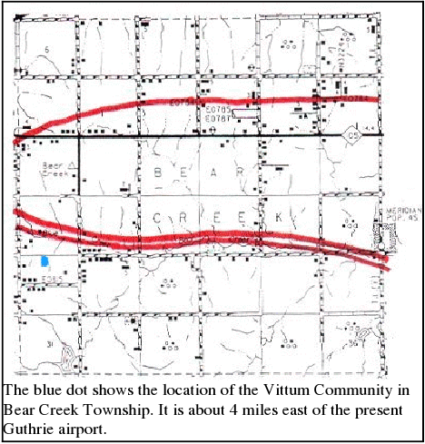 The West Guthrie Dairy was in business for about four years. The cows were pastured out on the edge of town, and night and morning were milked by the girls in the open field (there was no barn). They sold and delivered the milk in town house to house for five cents a quart or six for twenty-five cents. Then disaster struck. The cows caught a disease called "the dry murr" and thus ended the dairy business.Grandpa then decided to go into the hotel and restaurant business. He rented the Banner Hotel of thirty-two rooms, which was directly across from the State Capitol5. Guthrie was then the territorial capitol of Oklahoma. Here they did a thriving business catering mostly to the state legislatures. Grandma cooked the meals. Grandpa ran the business and did the buying. Aunt Myrtis waited on tables and cleaned the rooms. Dad and Tom washed dishes and "did everything else that they couldn't get out of." Roy had a team of mules and did teaming in town. Grace at this time was married to Tom Owens, who ran a butcher shop where Grandpa bought his meat for the hotel. Alice who had married Jim Botts lived in Hobart, Oklahoma. Esbun was a baby then. It seems the state legislature met only every two years, so after the final session one year Grandpa sold his interest in the business and bought the "Young" farm (one hundred sixty acres) five miles southeast of Guthrie near the "Vittum Community" and the Prairie Grove School.6 This was the school that Dad graduated from at the age of twenty-one and also where he met our mother Pearl Benson. The year Dad graduated from grade school, 1900, Grandpa was appointed superintendent of schools of Logan County. Dad entered Central High School in Guthrie and attended for one year. The following summer he took a six week course at the Teachers Normal School (also in Guthrie) for which he received a third-grade teachers certificate. He then applied for a teaching job at the Bear Creek School located four miles east of their farm. He wanted to teach at this school so he could live at home and not have to room and board out. To Dad's dismay the job had already been filled. Dad finished out that summer working on the Styles farm picking and 5 - City of Guthrie Business Directory 1894: Banner Restaurant, 321 w Oklahoma. 6 - Vittum was located in the northeast Corner of the northwest quarter of Section 30, Twp 16N , Range 1W (Meridian Twp). See picture on page 5. Page 3 of 9