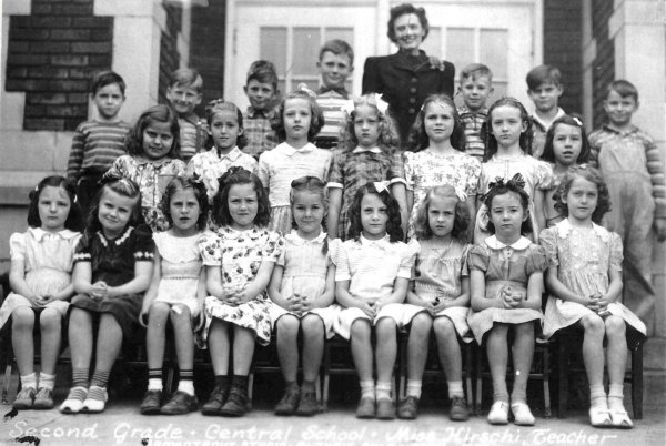 Third row: Mickey O'Brien, Charles Scott, ? , Frank Daniel, Miss Hirschi, teacher; Bill Blair, ? , and Bert Fry.