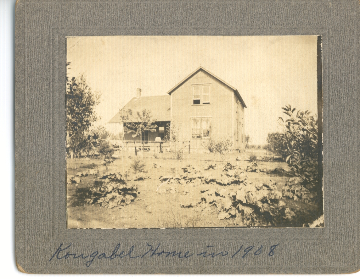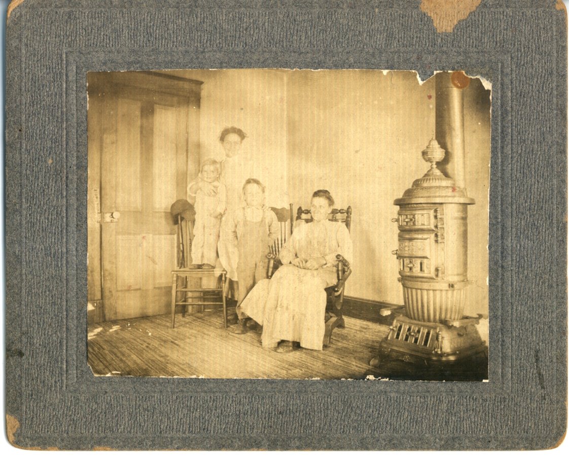 | Picture of the W. F. (Will) Kongable farm home on the west side of what is now North Pine about 1/2 mile north of Summit View cemetery. Taken in 1908. The house still stands and until quite recently was occupied by Helen Birch Whittington. W. F. Kongable and his family came to Guthrie from Richmond, Kansas on February 1, 1903. They first lived in rented quarters near Hwy 77 north of Guthrie. In September 1903 W. F. Kongable bought the 80 acre farm north of Summit View cemetery and built "a new 2-story house." They raised their own food except for staples such as sugar, flour and coffee. Will Kongable died on 8 January 1908 of typhoid fever, leaving his widow, Henrietta, to run the farm and raise 7 of her 9 children who remained at home, ages 19 to 3. Henrietta Kongable in the living room of this house with 3 of her children. The youngest, standing in the chair, is Harold J. Kongable, who later graduated from Oklahoma A & M and became a vice-president of Westinghouse. |