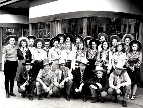The young man first on the right is Jack Craig. The little fellow in the cowboy hat kneeling second from the right is Richard Reed (me). The older man in the striped tie third from the right is Mr. Cox, the manager. The young man on the far left is James Overstreet. The only lady I can remember is Hazel Smith in the last row, fourth from the right.